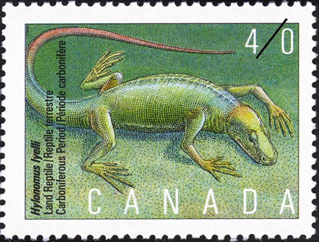 Joggins Fossil Cliff’s “Hylonomus Lyelli,” named for geologist Charles Lyell, found 1859 with William Dawson. Canada Post, April 1991
